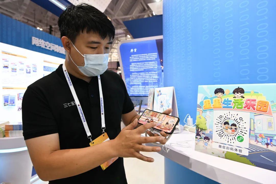 2022年8月28日,在国家会展中心(天津),参展人员在2022年中国网络文明大会上展示一款为孤独症儿童开发的功能性应用软件。新华社记者孙凡越摄