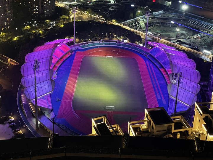 此次亮化提升工程坚持绿色低碳,突出节能环保,通过“一把闸刀”智能调光系统一键切换,实现体育场常态模式、赛时模式等多种场景应用;通过“主控—分控—灯具”三级控制,达到体育场看台两侧灯光效果的同步,精准的控光技术让照明频闪更低、照度更均匀,为运动员和观众提供更舒适的夜景观。