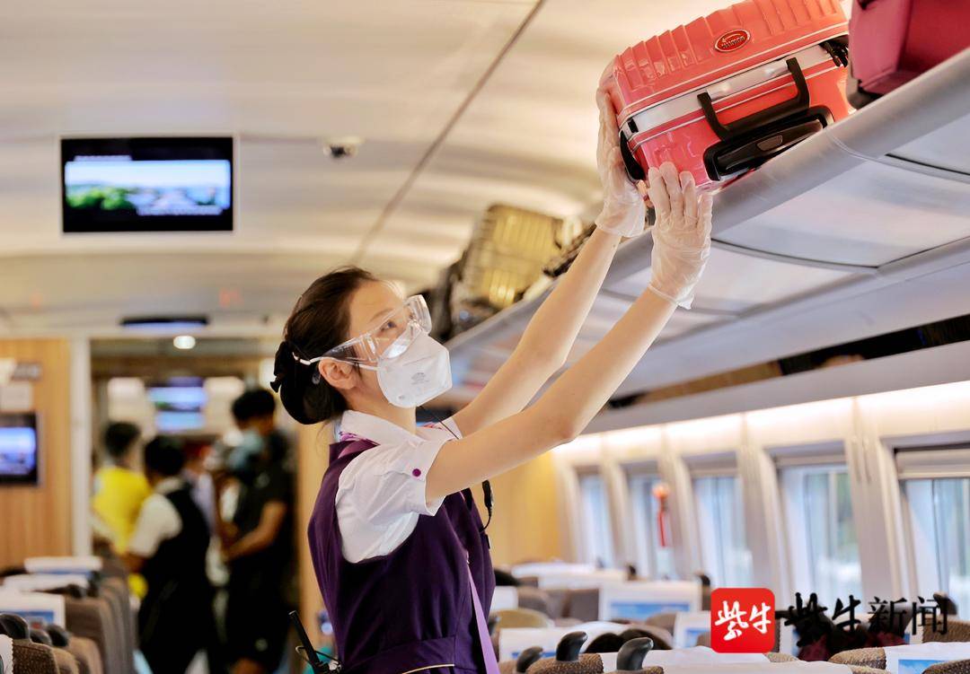 G7714次列车乘务员在车厢内整理行李架物品(周围摄)