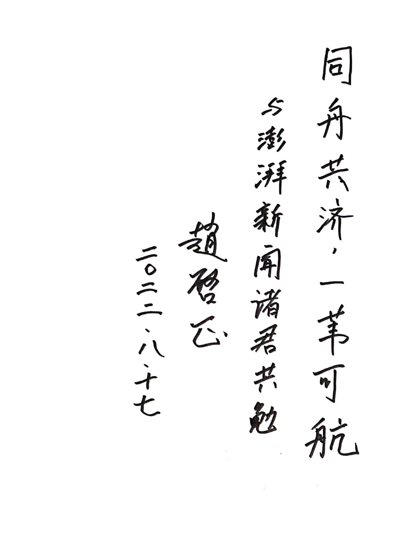 国务院新闻办公室原主任赵启正:同舟共济,一苇可航,与澎湃新闻诸君共勉。