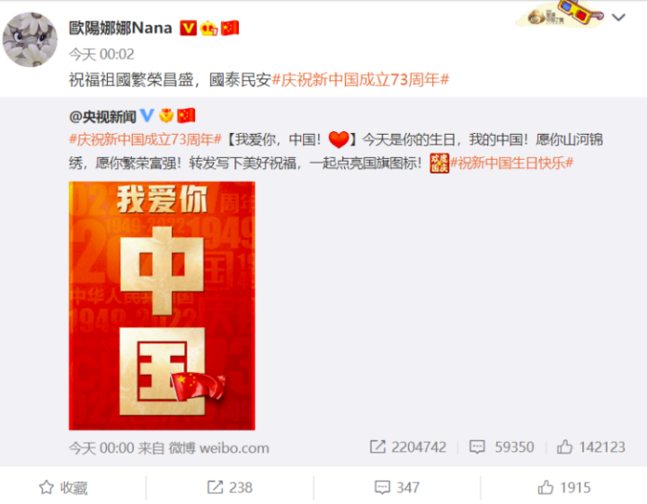 岛内绿媒“三立新闻网”今日上午7时许发文称,央视新闻官方微博今日准时在零点发布庆祝新中国成立73周年的文字与图片:“#庆祝新中国成立73周年#【我爱你,中国!】”,台湾艺人欧阳娜娜零时2分在微博迅速转发这条微博,在短短2分钟内的时间写下,“祝福祖国繁荣昌盛,国泰民安#庆祝新中国成立73周年#”。报道还在标题中形容称,“欧阳娜娜开第一枪”。绿媒《自由时报》则声称,欧阳娜娜“光速转发”央视“我爱你中国”微博。