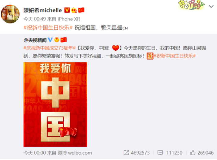 今天是中华人民共和国成立73周年。欧阳娜娜、陈妍希、陈乔恩等多位中国台湾艺人在今日零时后发微博祝福祖国繁荣昌盛。这一切岛内绿媒果然都在盯着。
