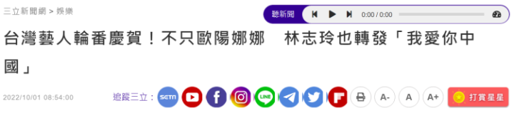 接下来,“三立新闻网”发现不止欧阳娜娜,而是“台湾艺人轮番庆贺”。报道称,台湾艺人汪东城转发@央视新闻的微博祝福祖国繁荣昌盛;“台湾第一名模”林志玲也转发央视“我爱你中国”微博,还写下“盛世中华,国泰民安”。报道还声称,前阵子因为“吃海鲜”风波被“骂爆”后的杨丞琳也转发央视微博,“高调”庆新中国成立73周年:愿锦绣中华,繁荣富强!#祝新中国生日快乐#