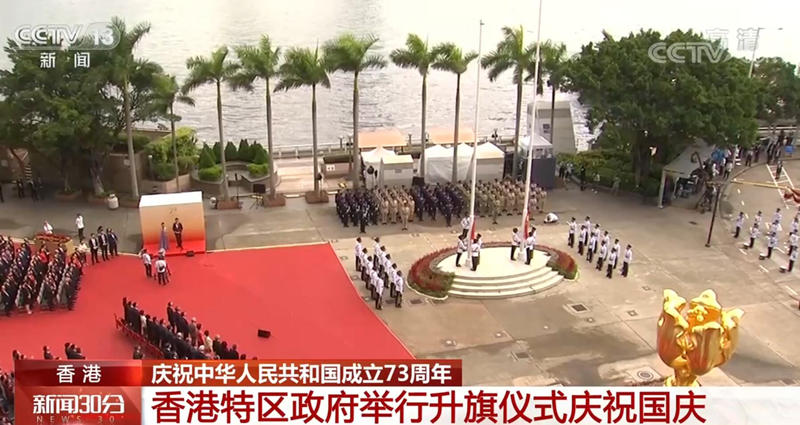 央视网消息:今天(10月1日)上午,香港特别行政区政府在金紫荆广场举行升旗仪式,庆祝中华人民共和国成立73周年。升旗仪式开始时,香港警察银乐队先奏响乐曲,香港纪律部队仪仗队和护旗方队均以中式步操迈步进入金紫荆广场。