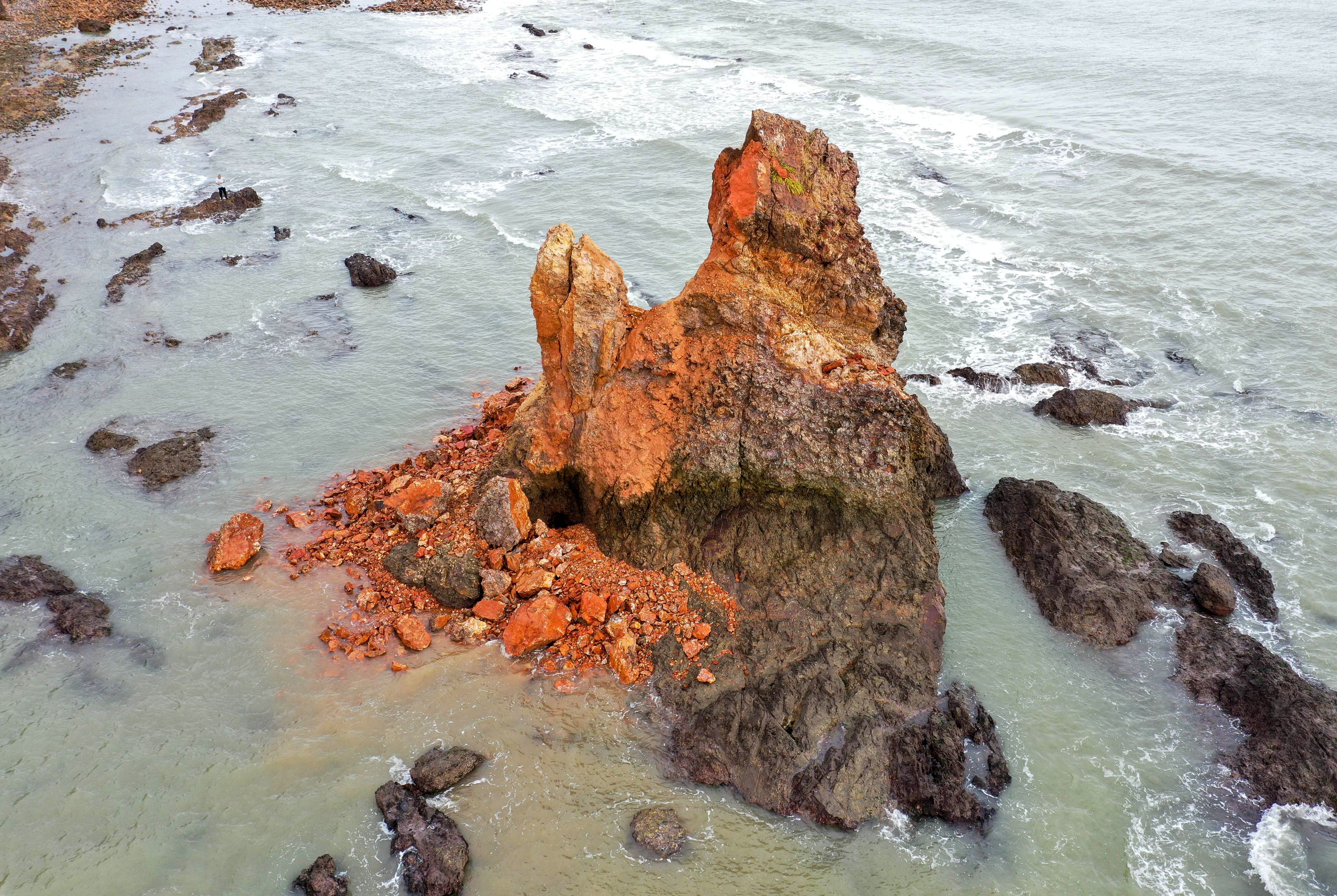 10月3日凌晨4点10分,青岛崂山区“石老人”海蚀柱上半部分突然坍塌。坍塌的“石老人”周围碎石一片,海水都被碎石染红。图/ICphoto