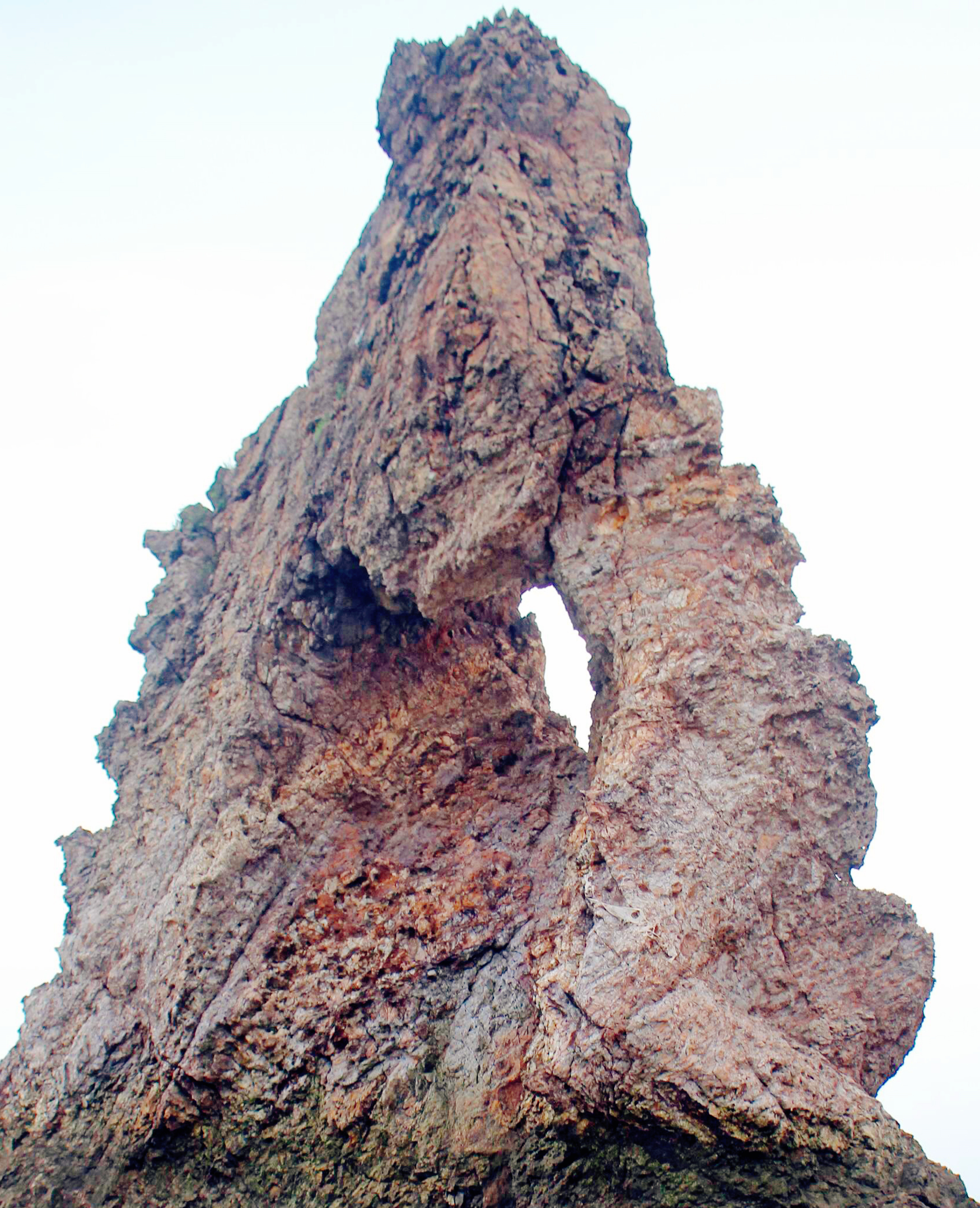 此次地质调查发现,“石老人”北半部明显呈薄弱、不稳定状态;北柱脚2.5米高程以下,凹进最甚,是海蚀流、浪冲刷、击打等综合作用结果;“石老人”顶、中部洞、柱脚,近于直立的构造裂隙,已割穿柱体,造成失稳状态。