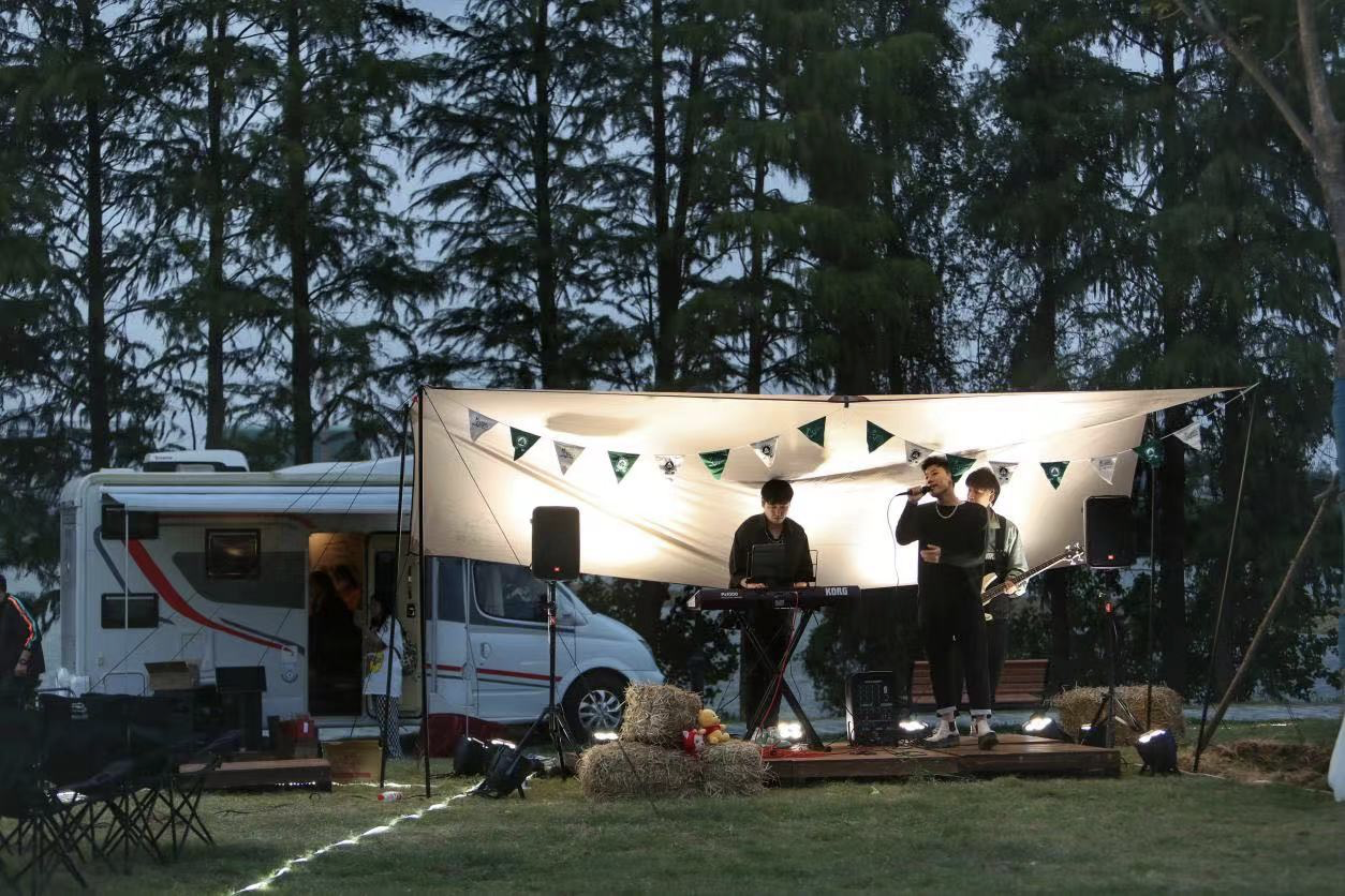 薄暮冥冥之时,山峦之间一隅,挂在树梢的灯泡一盏盏亮起,房车营地又进入了一天中最富有情调的时刻。