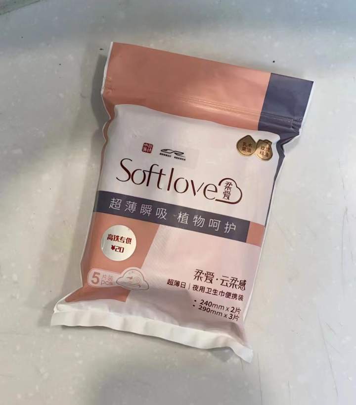 “为了满足女生的特殊需求,这个卫生巾是定制的,不同于一般一包卫生巾里面只有夜用或者只有日用,这一包卫生巾选择了质量有保证的品牌,便携式包装,一包里面有5片,售价20元,包括2片240毫米的日用款和3片290毫米的夜用款,2+3的搭配应该可以满足女性乘客应急用。”李工告诉记者,高铁上线的卫生巾,属于保障性用品,不会像一般产品一样推销和展示,而是和口罩等一起归属到便民保障性产品。