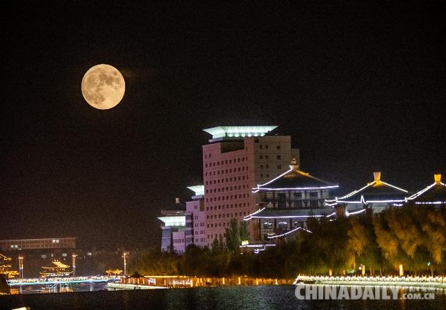 2022年10月9日,甘肃敦煌大漠随着太阳落下,天边绚烂的彩霞慢慢消散。一轮金色圆月从东方冉冉升起,像一盏明灯高悬在敦煌苍茫的大漠和繁华的城市上空。秋夜的风越来越寒凉,皓月当空让人惊艳不已,象征着事事圆满,亲人的团圆,家庭的美满。
