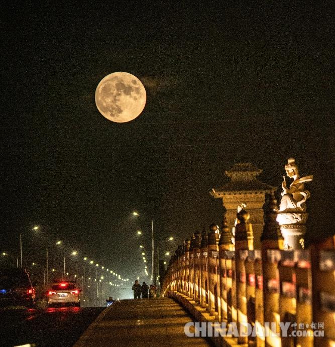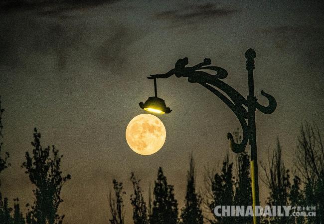 图为:2022年10月9日,用相机多重曝光技法拍摄的敦煌党河风情线上空的超级圆月。