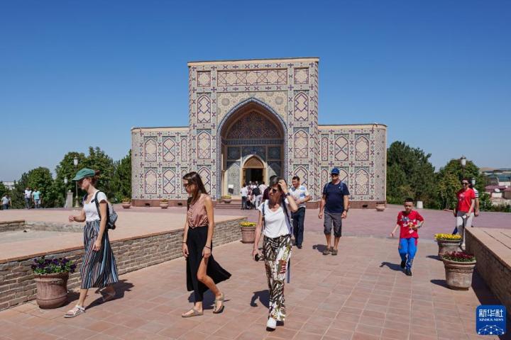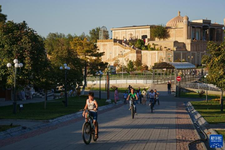 9月3日,在乌兹别克斯坦撒马尔罕,人们骑车游览。