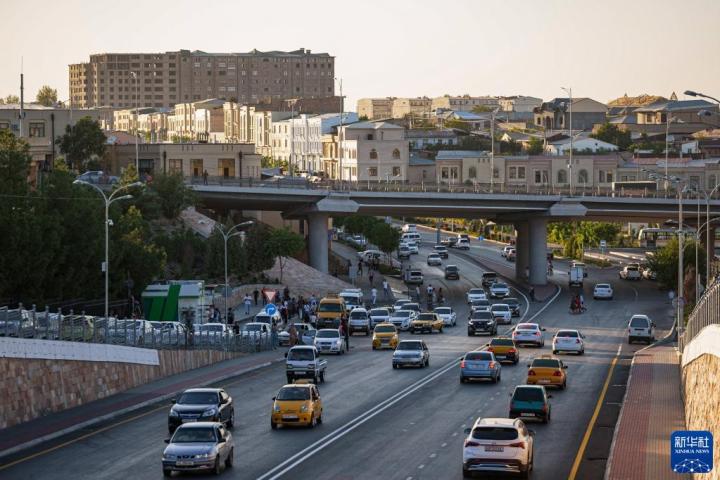 9月3日,在乌兹别克斯坦撒马尔罕,车辆行驶在道路上。