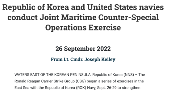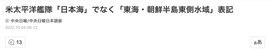 此外,《中央日报》日语版还称,在9月26日发布的美韩海军演习有关消息中,也使用了上述表述。在9月26日的新闻稿中,美国太平洋舰队不仅在电头写有“朝鲜半岛以东海域,韩国”字样,稿件还称:“‘罗纳德·里根’号航母战斗群于9月26日至29日在东海(East Sea)与韩国海军开始了一系列演习……”