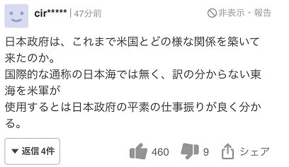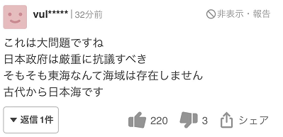 《中央日报》日语版4日发布的报道很快引来日本网民的不满,有多名网民称应该向美方提起抗议。有人说:“这是一个很严重的问题。日本应该提出严正抗议。作为前提,根本没有一处海域叫做(韩国)‘东海’,那块海域从古代就被称为日本海。”