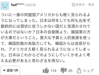 也有人评论称:“日本终于开始被最亲密的同盟国美国小瞧。是不是被美国看出来,日本是什么都干不好,从结果上来说只能追随的国家?(韩媒报道中的)这种做法就代表美方认为比起日本自卫队,韩国军队更重要。日本使用了大量的人力财力,为了防卫韩国而合作,却被韩国认为是添乱,甚至还被美国小瞧。不得不认为,日本有必要思考接下来要怎样行动。”