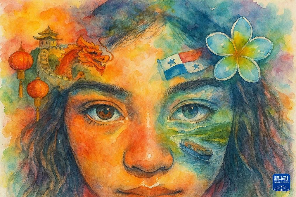 这是获得“我眼中的中国和中巴关系”大赛绘画类别第一名的作品《两个世界,一种目光》。新华社发(中国驻巴拿马大使馆供图)