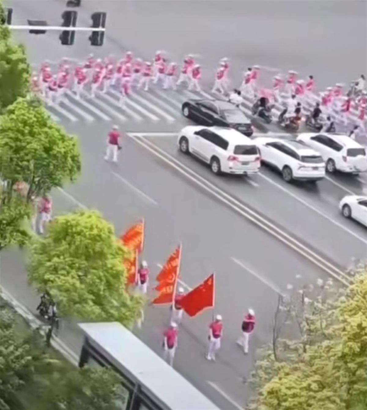 网络视频显示,一支举着旗帜、统一着装的队伍,随着音乐在机动车道上行走,到了斑马线还掉头,各个方向的车辆均只能停下等待。