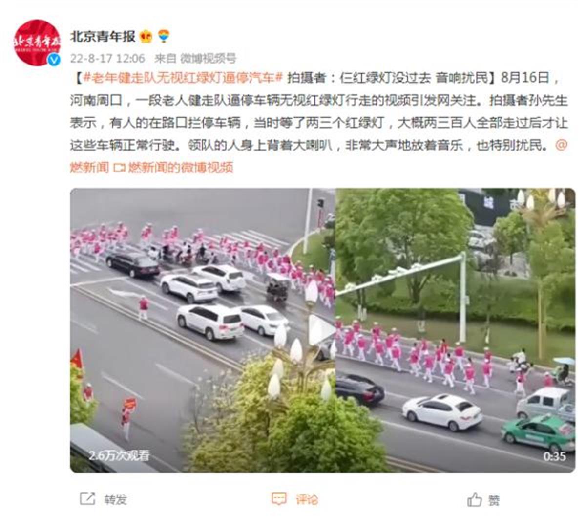8月17日,一则“河南周口一健走队逼停车辆,无视红绿灯行走”的视频,引发网友热议。目击者称,红绿灯变了三次,这支健走队伍才走完。郸城县交通大队表示,将进行调查处理。(据8月17日极目新闻)
