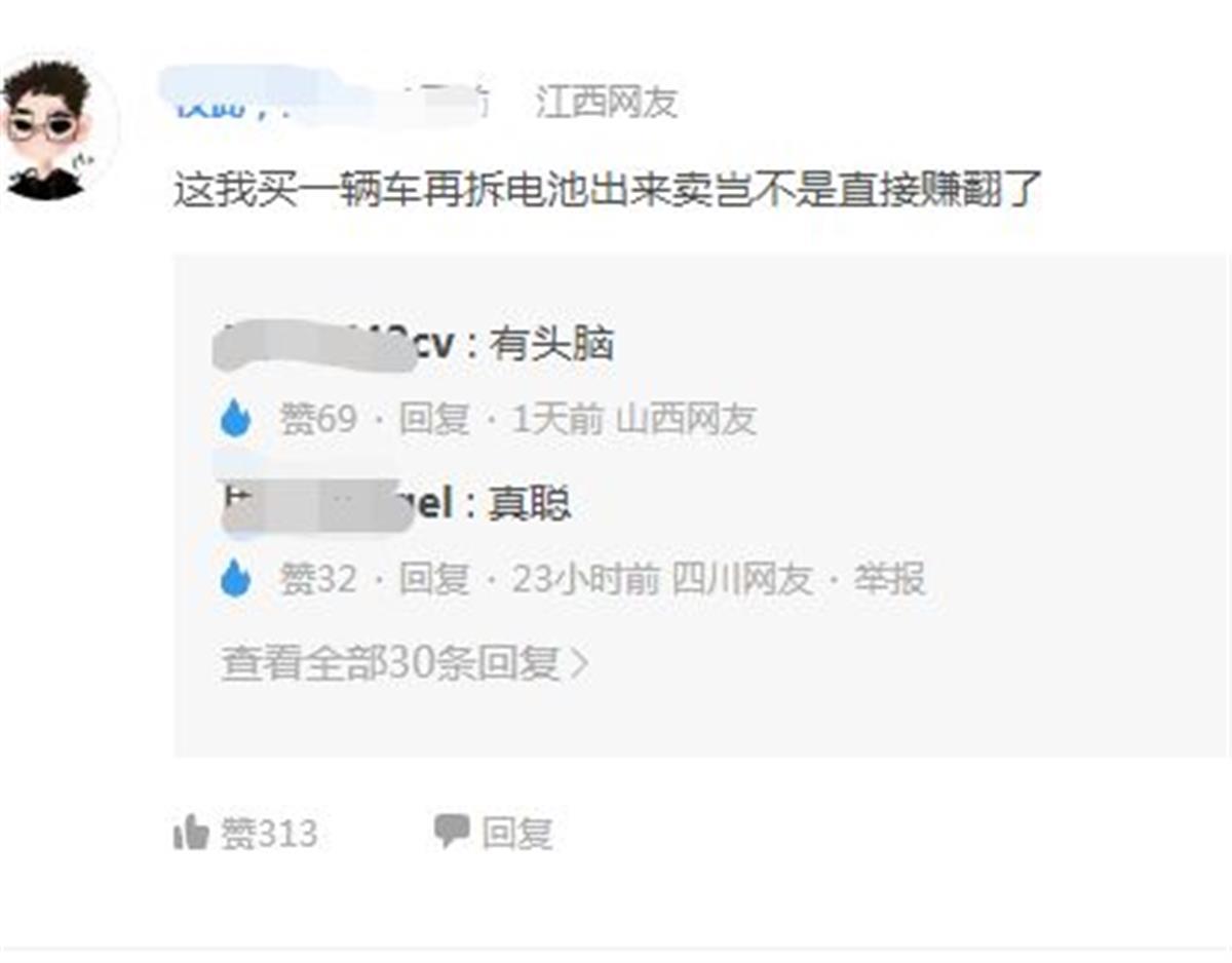 当前,新能源车的车主,对电池组的安全疑虑是有的,也只能到官方的4S店维修,如果看到这样的价格,在别无他法的情况下,难道把车扔了?但是,一辆车的生命周期都是以十年计,这样扔了,不说是车主的损失,也是对资源的极大浪费。有网友调侃道,买一辆新车然后拆电池卖,还可以赚几万元。