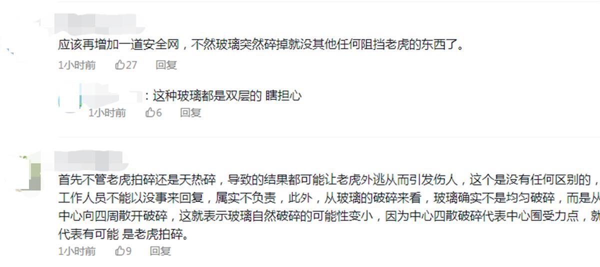 我们寻找玻璃碎裂的原因,就在于园方有推责的嫌疑。把玻璃碎裂的原因怪到天气身上,如果是老虎拍碎的,那么说明玻璃的质量不过关,园方没有把游客的安危放在心上。