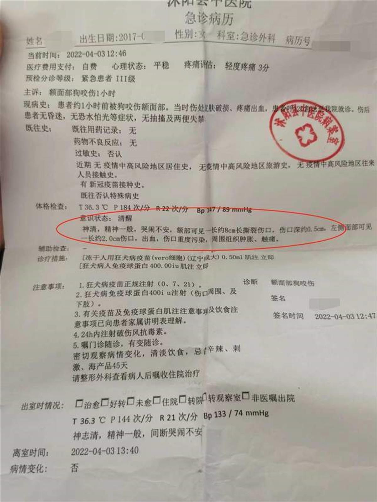 从孩子父亲发出的照片来看,女孩额头上有很长很深的一道伤疤,而根据急诊病历显示:孩子额部可见一长约8厘米撕裂伤口,伤口深约0.5厘米,左侧面部可见一长约2厘米伤口,出血,伤口重度污染,周围组织肿胀、触疼。小女孩面部受到如此严重的创伤,父母当然心如刀割,只想尽快让孩子恢复健康,不留疤痕。而除了身体上的伤害之外,女孩精神上也受到了严重的惊吓。刘先生表示,孩子现在看到狗依旧会出现应激反应,经常做噩梦,医生建议持续做心理康复治疗。