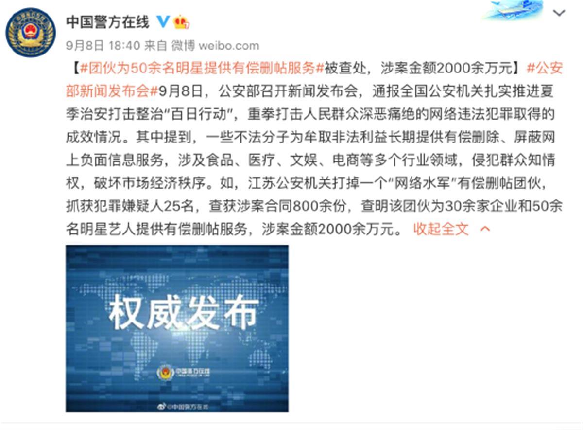 9月8日,公安部召开新闻发布会,通报全国公安机关扎实推进夏季治安打击整治“百日行动”,在介绍“网络水军”有偿删帖违法犯罪这一网络犯罪突出表现形式时,举例称,江苏公安机关打掉一个“网络水军”有偿删帖团伙,抓获犯罪嫌疑人25名,查获涉案合同800余份,查明该团伙为30余家企业和50余名明星艺人提供有偿删帖服务,涉案金额2000余万元。(据9月8日央视网)