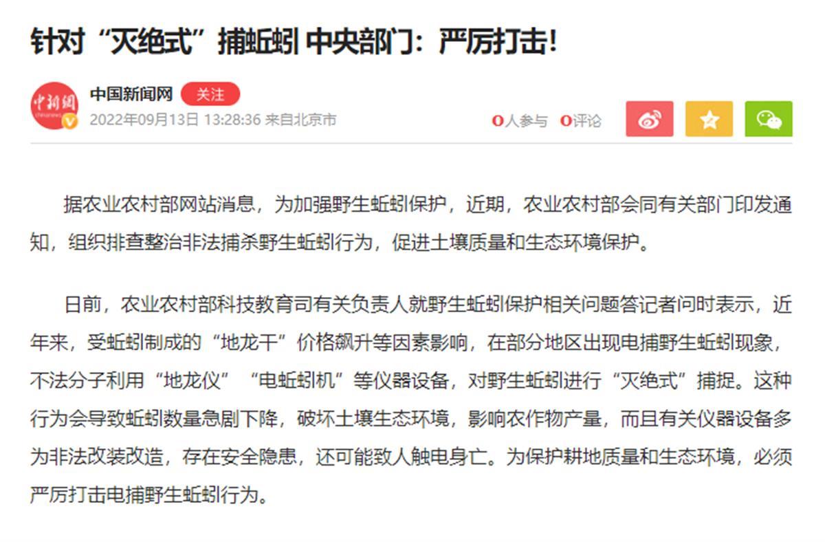 现在,农业农村部官宣电捕野生蚯蚓违法,这就给改变残酷的现实带来契机,令人欣喜和振奋。特别值得一提的是,有关部门在对非法捕杀野生蚯蚓行为进行整治的同时,要求及时下架处理野生蚯蚓捕杀产品设备。这一点,无疑打到了七寸。因为管住了“地龙仪”等捕杀设备,就等于保护了蚯蚓。