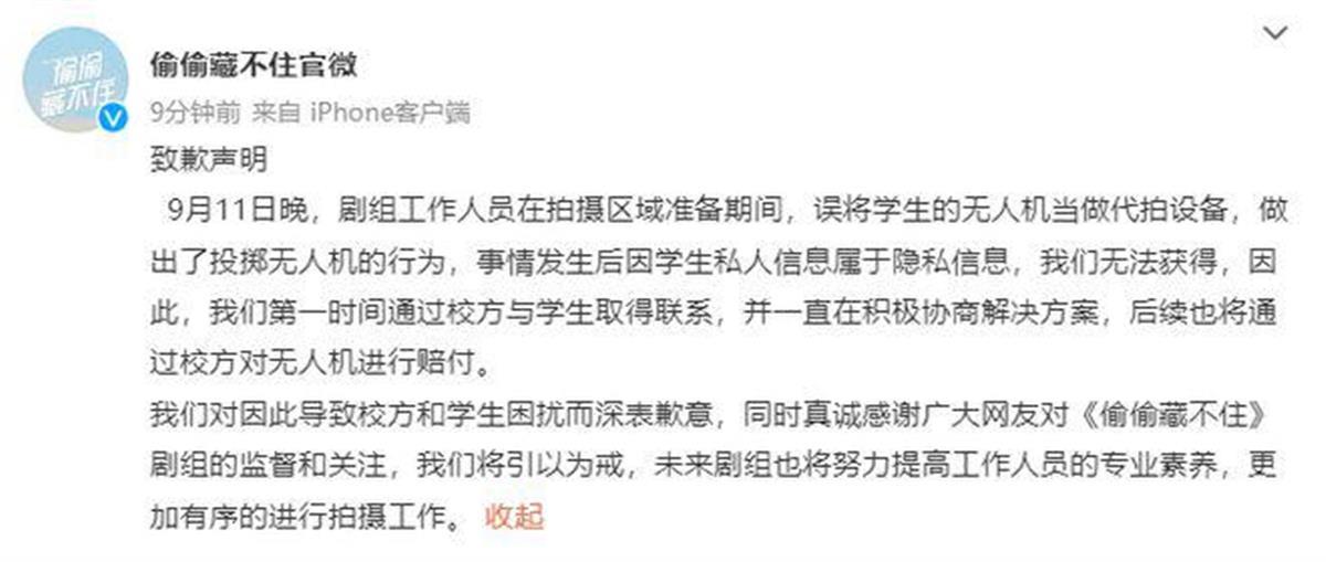近日,由赵露思、陈哲远主演的电视剧《偷偷藏不住》摊上事了,一位经常用无人机拍摄校园的学生,曝光剧组砸坏他的无人机。9月13日,剧组发布致歉声明,称将学生的无人机当成了代拍设备,将对无人机进行赔付。(据9月13日荔枝新闻)