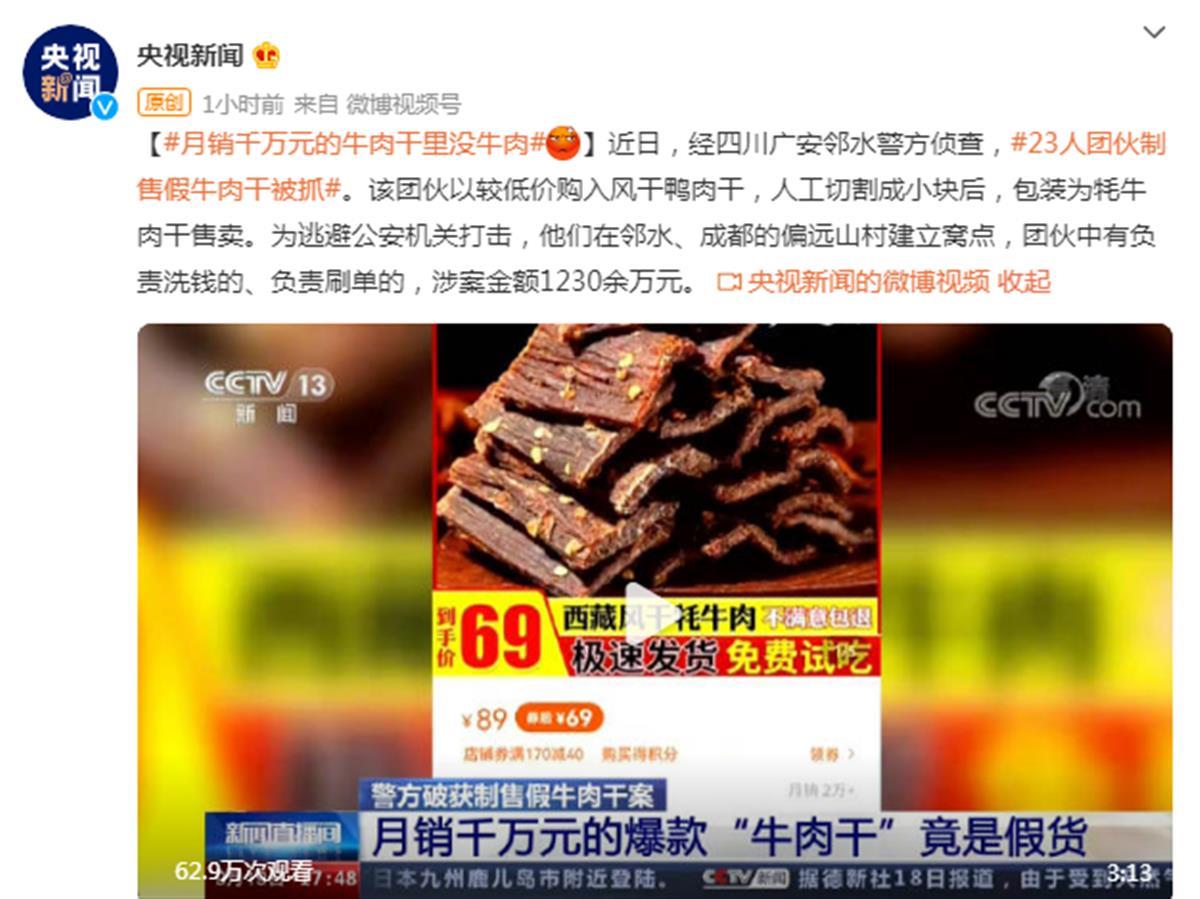 而这一案件的调查过程,其实很值得深思。市场监管执法人员在例行检查中,发现了奇怪之处,在并不盛产牦牛肉的四川广安邻水县,却有大量的牦牛肉干发货到外地,这想想就不太正常。于是立刻上门突击检查,发现问题严重后移交警方,警方顺藤摸瓜,挖出制假售假、刷单炒信的产业链,跨省追捕,一举铲除。
