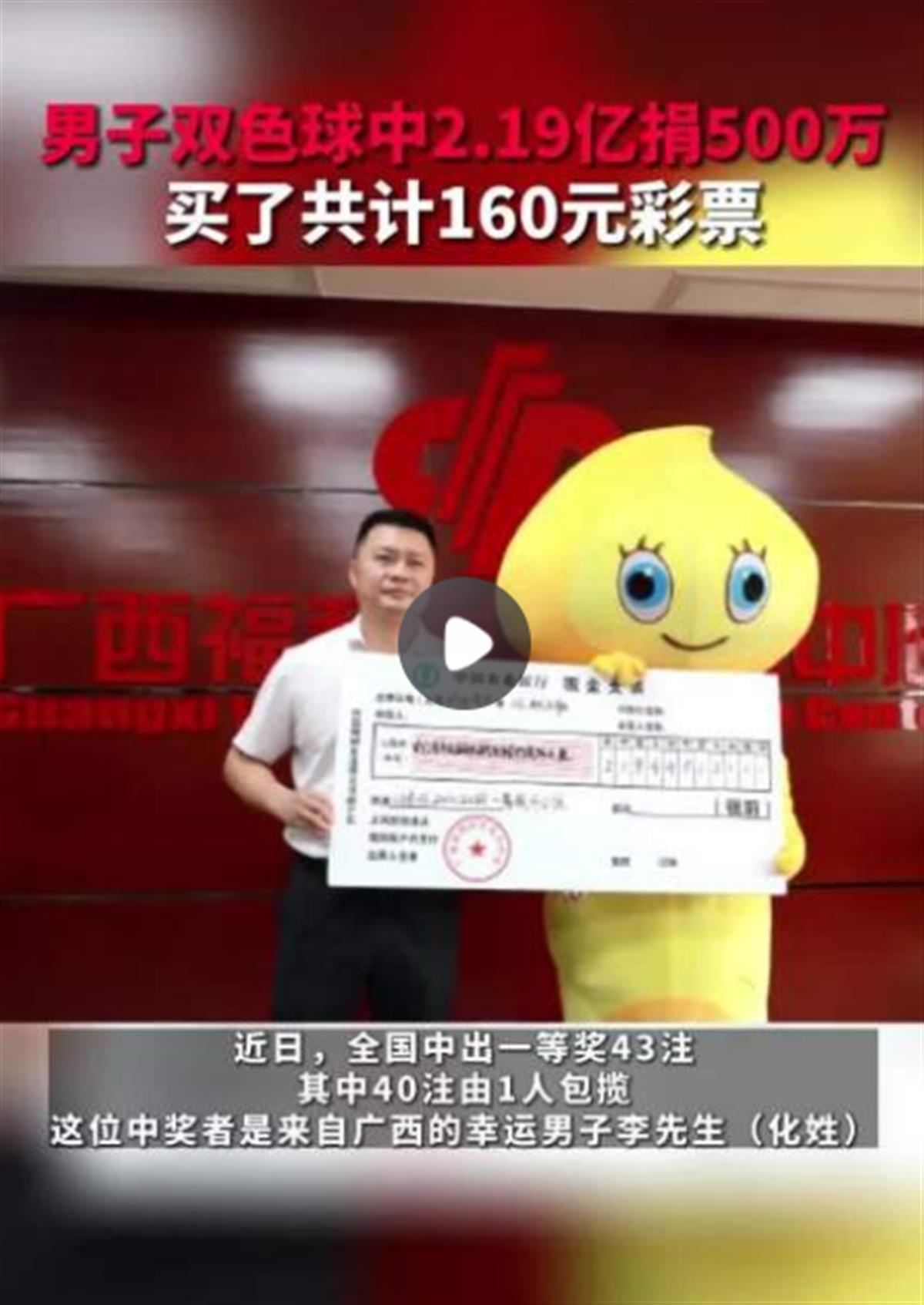 10月24日上午,福彩双色球2022120期2.19亿元大奖得主李先生(化姓),从广西福利彩票发行中心党总支部书记、主任蓝挺手中接过现金支票。兑奖现场,李先生捐出善款500万元委托广西福彩中心用于公益事业。(据10月24日《南宁晚报》)
