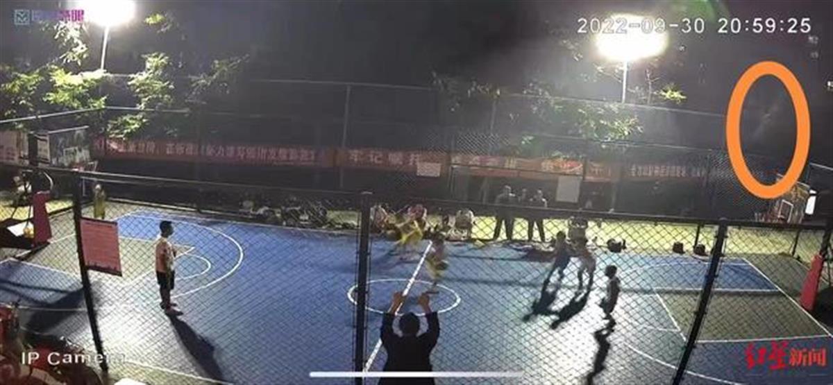 范某扔下的饮料瓶砸向篮球场内 (来源:红星新闻)