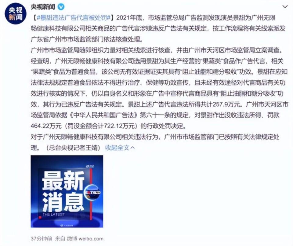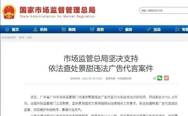 最引人注目的,应该是演员景甜为某公司相关商品的广告代言涉嫌违反广告法有关规定。