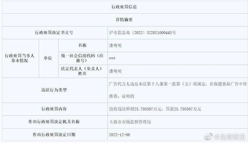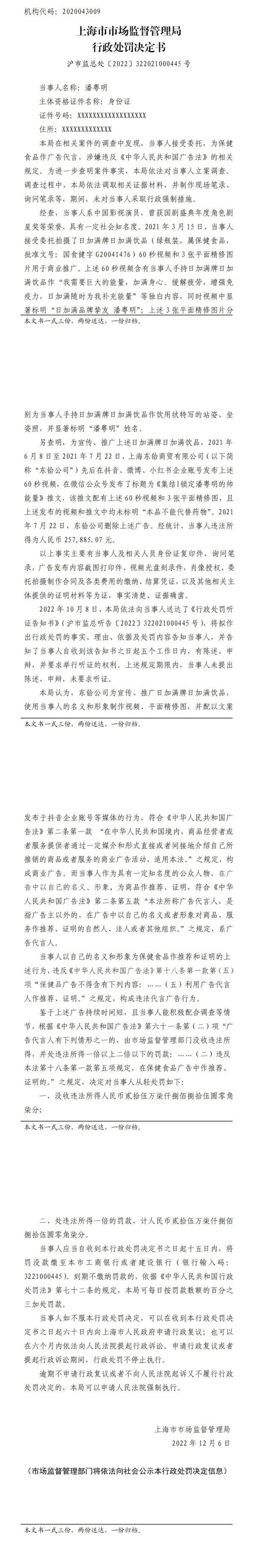 处罚详情显示,2021年3月,潘粤明接受委托拍摄了日加满饮品(绿瓶装,属保健食品)视频和图片用于商业推广,同时视频中显著标明“日加满品牌挚友潘粤明”,违反广告法中“保健品广告不得利用广告代言人作推荐、证明”之规定。