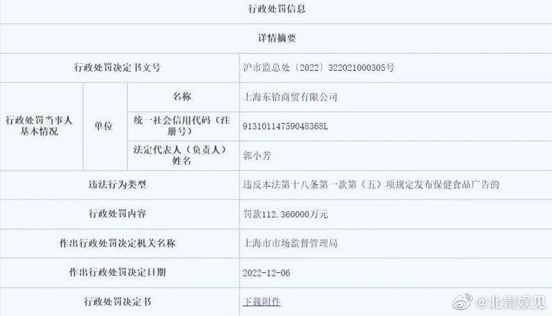 此外,东铪公司违反《广告法》规定发布保健食品广告,被罚款112.万元。