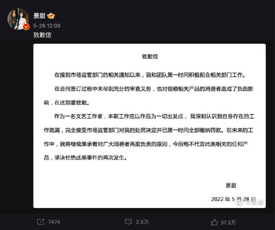 新闻曝光后,景甜于5月28日中午十二点发布致歉信。