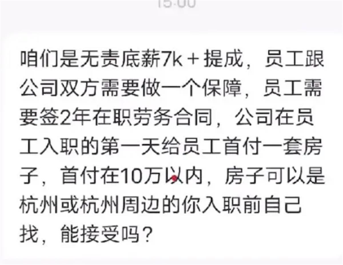 想到这一层,再看看该公司的回应,就更加觉得“水太深”。该公司表示,因为招的是骨干,不是普通职员,需要跟公司一起发展壮大,所以,员工跟公司双方需要做一个保障。也就是说,这个房子,相当于是员工交的一个担保?把员工都变成房奴,以后就不敢轻易辞职了?这是在强行要求员工掏真金白银表忠心,跟公司利益捆绑,“双向奔赴”吗?手段未免也太拙劣了一点吧。公司真的为了员工好,觉得员工很需要一套房子安定下来,那不如别整那些花哨的,直接给员工发一套房子吧!