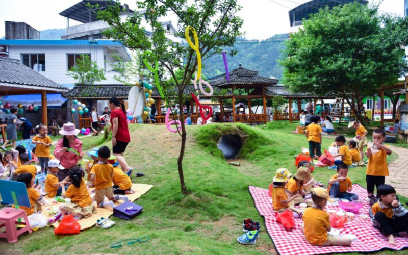 ▲2020年6月1日,广西桂林的龙胜各族自治县幼儿园举办了一场“野餐”活动,在草坪上孩子们铺上餐布,边享受美食,边聊天、做游戏。新京报资料图