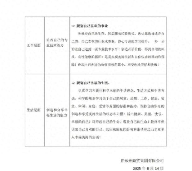 8月14日,据媒体报道,于东来在自己的社交平台上发布了《胖东来对刑释人员的面试题》,并表示“这也是对刑释群体真诚分享的进入社会的幸福生活方式方法的智慧”。于东来配文称:“因为爱,世界会越来越美好!相信这是这个群体在胖东来工作后未来的样子!这也适合各个行业追求美好的人们运用!”