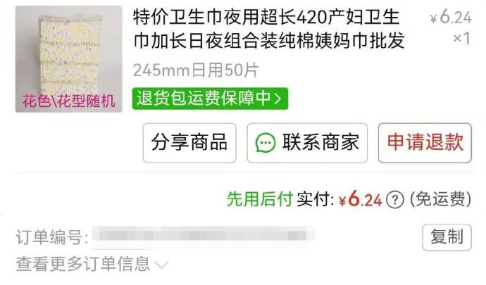 当事人雷同学称,她于9月16日网购了这批卫生巾,用到还剩几片时发现了上述字迹,她已举报涉事店铺,订单截图显示她购买了50片长度为245mm的日用卫生巾,价格为6.24元,且免运费,每片均价一角二分。