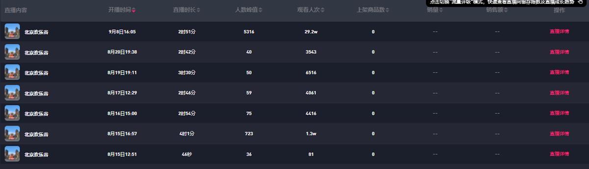 北京欢乐谷在8日直播数据暴涨(图片来源:抖查查)