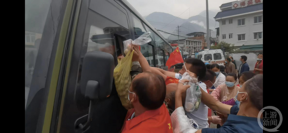 ▲泸定县得妥镇群众热情送东西给归建官兵。图片来源/四川森林消防总队