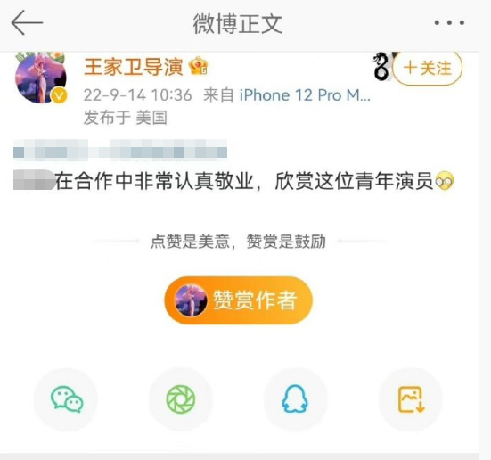 14日上午,一个微博账号截图在网上流传开来,一个账号名为“王家卫导演”的个人的账号在微博发言支持某位艺人,引发了部分网友的误会。有网友误以为真,以为王家卫导演有了“粉籍”,新电影没有着落但是却开启了追星生涯,对此表示了震惊,“没想到我高看了王家卫。”在不少王家卫电影迷的心中,这位导演不像是会做出“追星”举动的。也有一些艺人粉丝受到了误导,误以为真的是导演给予的肯定而颇感高兴。