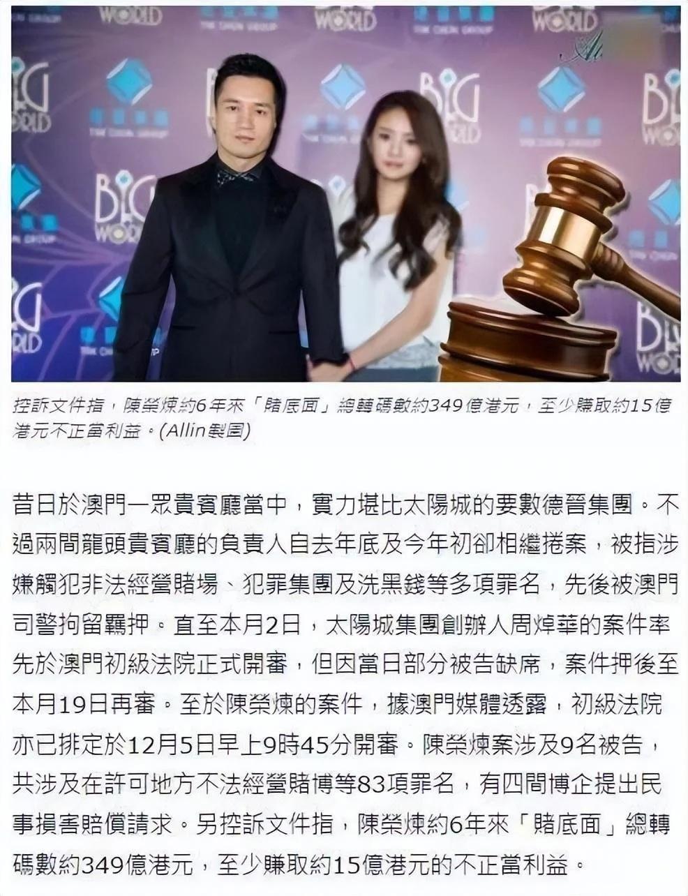 德晋集团负责人、安以轩的老公陈荣炼被控犯罪集团等83项罪,“赌底面”总转码数约349亿港元(约人民币309亿元),至少赚取约15亿港元(约人民币13亿)不正当利益。控方案情指出,陈荣炼建立“德晋贵宾会”,至少自2014年起与众被告在各娱乐场经营“赌底面”,内部以“外底”或“星数”为暗号,以约定比例私下接受赌客“台底”投注,将“台面”赌注在“台底”以倍数加大,码佣亦加大两倍。为防避博监局监督和检查,集团会提交虚假财务报表。