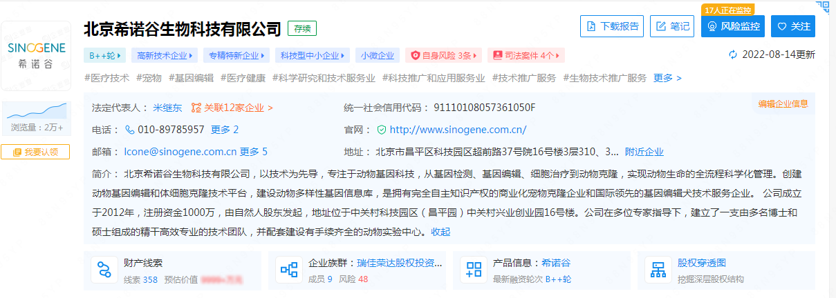 成立于2012年的北京希诺谷生物科技有限公司是国内比较知名的可提供宠物克隆服务的企业之一。希诺谷的客服人员介绍,目前,克隆猫狗的价格并不相同。克隆猫的报价是25万,现在活动价是10万。克隆狗则根据品种报价。并且,全国都可以安排上门取样,“只要采样好了,克隆成功只是时间问题。”