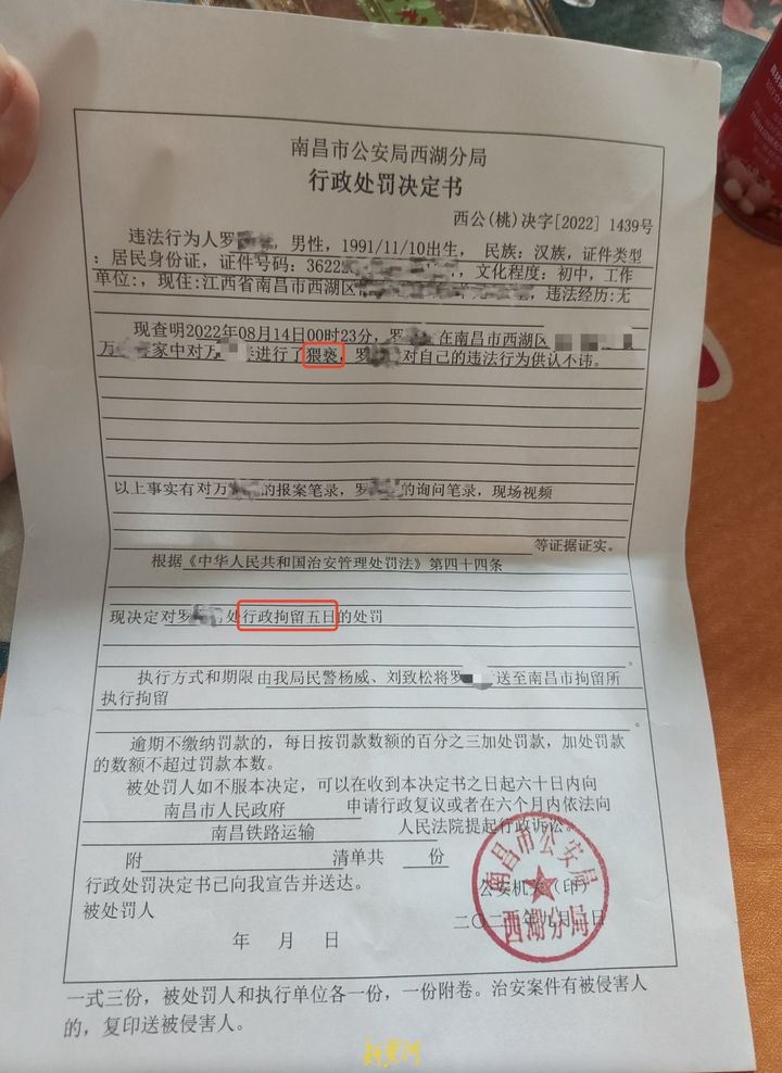 9月15日下午,南昌市公安局政治处工作人员告诉记者,“已经结案,行政拘留5日。我们已经电话告知她处罚决定,她如果有疑问的话可以到派出所查看具体的处罚决定书。”