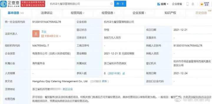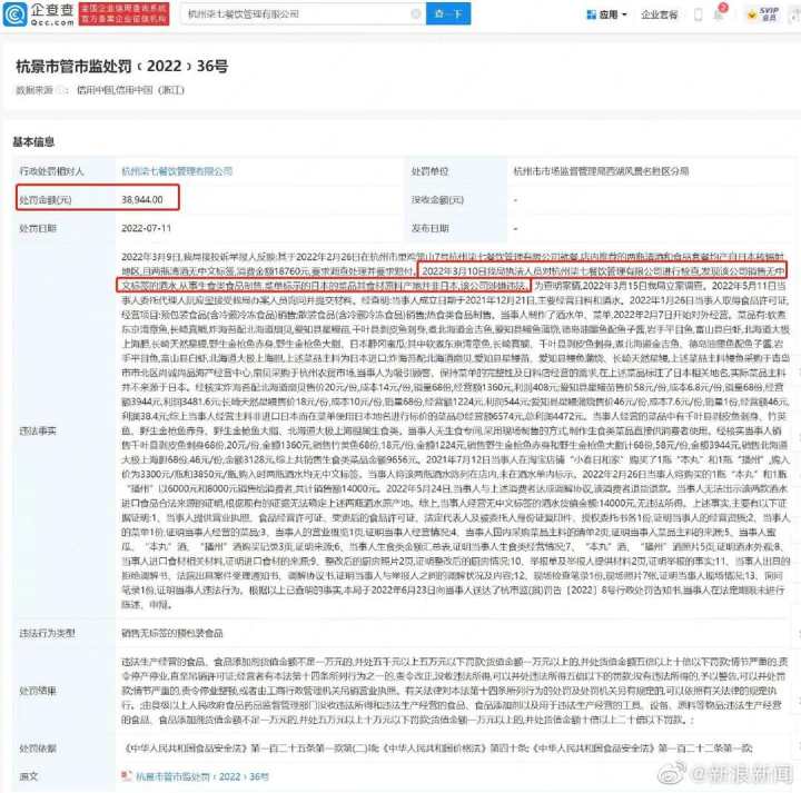 近日,企查查APP显示,杭州柒七餐饮管理有限公司因销售无标签的预包装食品被杭州市市场监督管理局西湖风景名胜区分局罚款38944元。