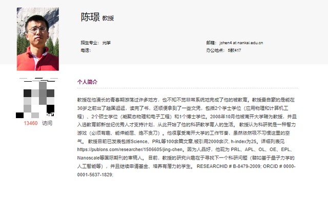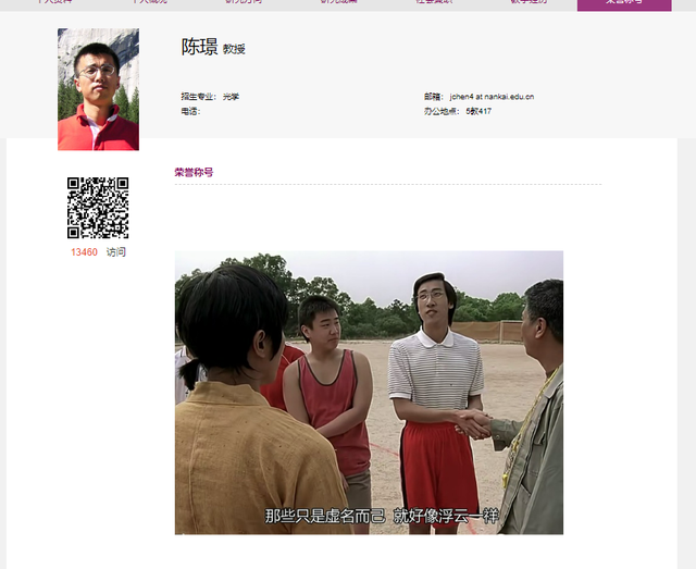 9月18日,潇湘晨报记者查询南开大学物理科学学院官网发现,除了胡金牛教授外,光学专业的陈璟教授个人简介也十分有趣。在简介中他称,青春期曾游荡过许多地方,并且用表情包表示自己获得的荣誉只是“虚名”,就好像浮云一样。
