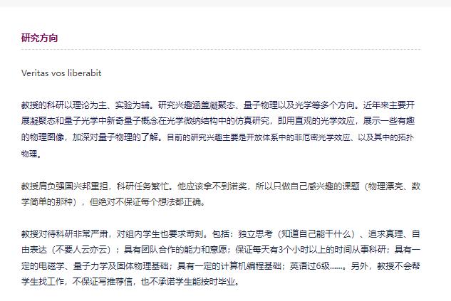 对于自己的研究方向,陈璟教授也有非常明确的目标:教授肩负强国兴邦重担,科研任务繁忙。他应该拿不到诺奖,所以只做自己感兴趣的课题(物理漂亮、数学简单的那种),但绝对不保证每个想法都正确。同时,教授对待科研非常严肃,对组内学生也要求苛刻。包括:独立思考(知道自己能干什么)、追求真理、自由表达(不要人云亦云);具有团队合作的能力和意愿;保证每天有3个小时以上的时间从事科研;具有一定的电磁学、量子力学及固体物理基础;具有一定的计算机编程基础;英语过6级......。另外,教授不会帮学生找工作,不保证写推荐信,也不承诺学生能按时毕业。