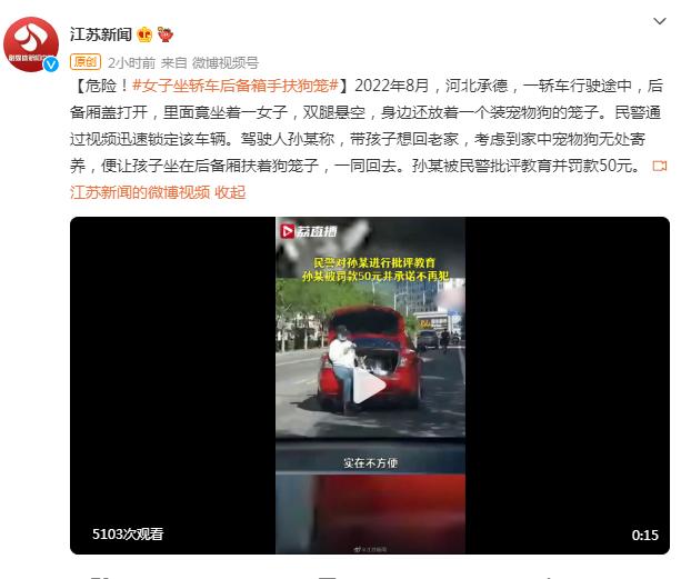 2022年8月,河北承德,一轿车行驶途中,后备箱盖打开,里面竟坐着一女子,双腿悬空,身边还放着一个装宠物狗的笼子。民警通过视频迅速锁定该车辆。驾驶人孙某称,带孩子想回老家,考虑到家中宠物狗无处寄养,便让孩子坐在后备箱扶着狗笼子,一同回去。孙某被民警批评教育并罚款50元。
