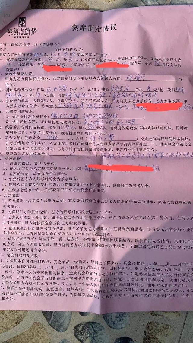 周先生表示,今年5月27日,他们在锦禧大酒楼预订了12月3日的婚宴,交了5000元定金,还签了《宴席预定协议》,协议规定如果取消或更改婚宴,需要提前三个月告知酒楼。
